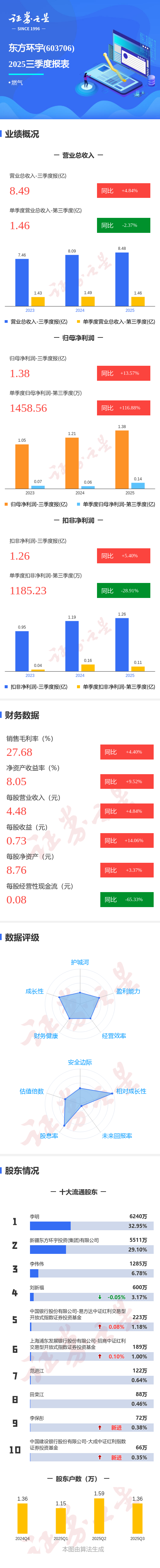证券之星消息,东方环宇2025年三季报显示,前三季度公司主营收入8.49亿元,同比上升4.85%;归母净利润1.38亿元,同比上升13.57%;扣非净利润1.26亿元,同比上升5.4%;其中2025年第三季度,公司单季度主营收入1.46亿元,同比下降2.37%;单季度归母净利润1458.56万元,同比上升116.89%;单季度扣非净利润1185.23万元,同比下降28.92%;负债率30.9%,投资收益803.4万元,财务费用64.51万元,毛利率27.68%。