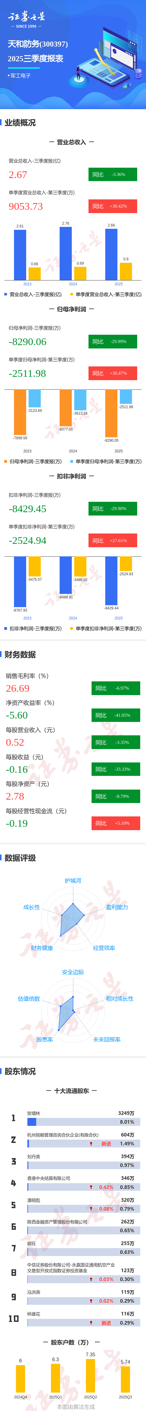 证券之星消息,天和防务2025年三季报显示,前三季度公司主营收入2.67亿元,同比下降3.36%;归母净利润-8290.06万元,同比下降30.0%;扣非净利润-8429.45万元,同比下降29.91%;其中2025年第三季度,公司单季度主营收入9053.73万元,同比上升30.42%;单季度归母净利润-2511.98万元,同比上升30.48%;单季度扣非净利润-2524.94万元,同比上升27.61%;负债率46.01%,投资收益-73.14万元,财务费用983.96万元,毛利率26.69%。