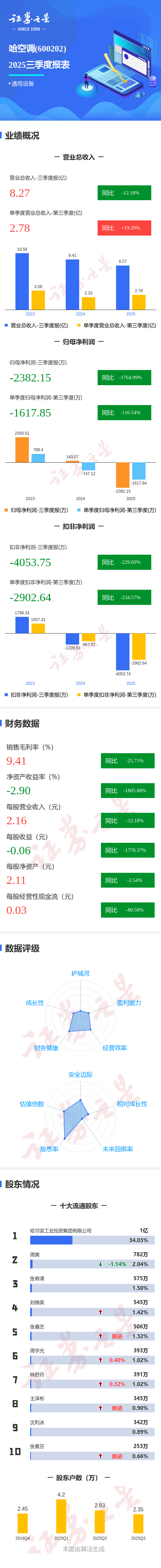 证券之星消息,哈空调2025年三季报显示,前三季度公司主营收入8.27亿元,同比下降12.19%;归母净利润-2382.15万元,同比下降1765.0%;扣非净利润-4053.75万元,同比下降229.7%;其中2025年第三季度,公司单季度主营收入2.78亿元,同比上升19.21%;单季度归母净利润-1617.85万元,同比下降116.54%;单季度扣非净利润-2902.64万元,同比下降234.57%;负债率69.96%,投资收益-58.99万元,财务费用2924.42万元,毛利率9.41%。