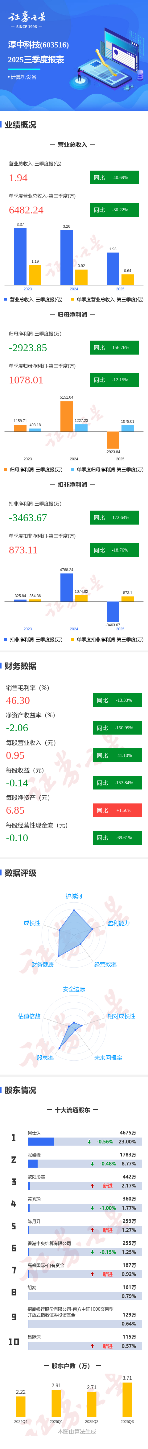 证券之星消息,淳中科技2025年三季报显示,前三季度公司主营收入1.94亿元,同比下降40.69%;归母净利润-2923.85万元,同比下降156.76%;扣非净利润-3463.67万元,同比下降172.64%;其中2025年第三季度,公司单季度主营收入6482.24万元,同比下降30.22%;单季度归母净利润1078.01万元,同比下降12.16%;单季度扣非净利润873.11万元,同比下降18.77%;负债率8.19%,投资收益-69.75万元,财务费用-1635.01万元,毛利率46.3%。