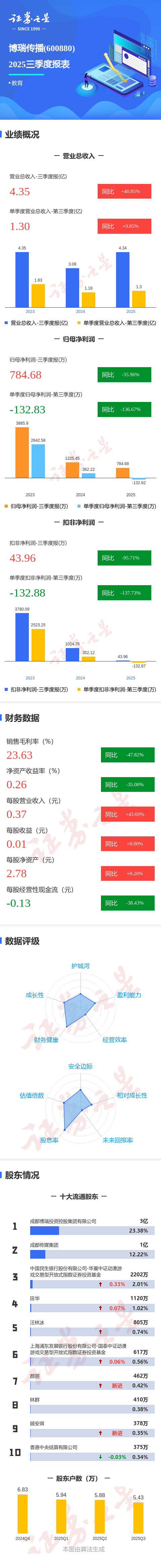 证券之星消息,博瑞传播2025年三季报显示,前三季度公司主营收入4.35亿元,同比上升40.86%;归母净利润784.68万元,同比下降35.97%;扣非净利润43.96万元,同比下降95.71%;其中2025年第三季度,公司单季度主营收入1.3亿元,同比上升9.86%;单季度归母净利润-132.83万元,同比下降136.67%;单季度扣非净利润-132.88万元,同比下降137.74%;负债率21.07%,投资收益751.22万元,财务费用302.53万元,毛利率23.63%。