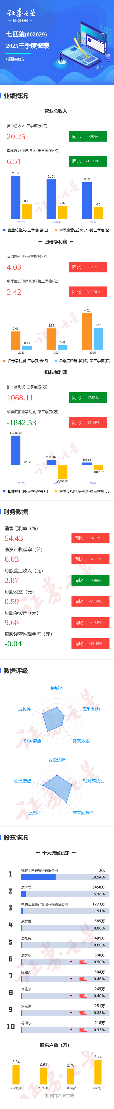 证券之星消息,七匹狼2025年三季报显示,前三季度公司主营收入20.25亿元,同比下降7.69%;归母净利润4.03亿元,同比上升70.98%;扣非净利润1068.11万元,同比下降47.54%;其中2025年第三季度,公司单季度主营收入6.51亿元,同比下降11.2%;单季度归母净利润2.42亿元,同比上升392.79%;单季度扣非净利润-1842.53万元,同比上升66.46%;负债率31.94%,投资收益7410.51万元,财务费用-5289.28万元,毛利率54.43%。