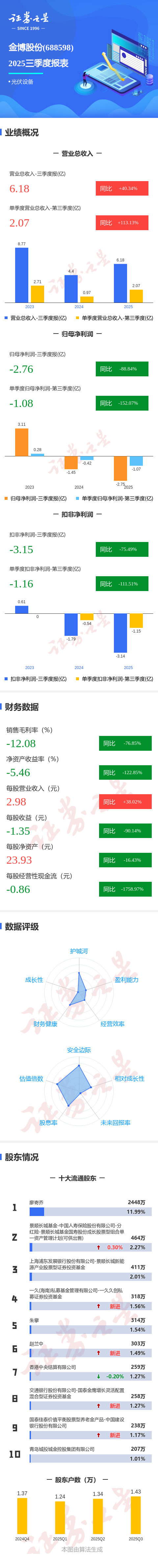 证券之星消息,金博股份2025年三季报显示,前三季度公司主营收入6.18亿元,同比上升40.34%;归母净利润-2.76亿元,同比下降88.84%;扣非净利润-3.15亿元,同比下降75.49%;其中2025年第三季度,公司单季度主营收入2.07亿元,同比上升113.14%;单季度归母净利润-1.08亿元,同比下降152.07%;单季度扣非净利润-1.16亿元,同比下降111.52%;负债率17.72%,投资收益2096.3万元,财务费用919.38万元,毛利率-12.08%。