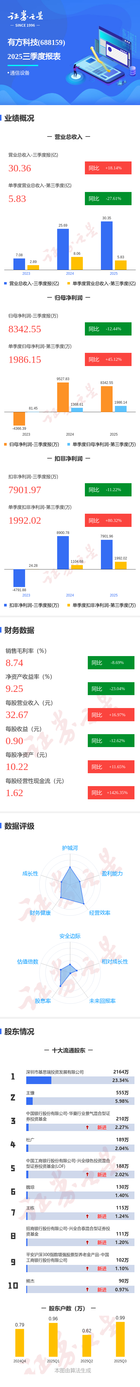证券之星消息,有方科技2025年三季报显示,前三季度公司主营收入30.36亿元,同比上升18.14%;归母净利润8342.55万元,同比下降12.44%;扣非净利润7901.97万元,同比下降11.22%;其中2025年第三季度,公司单季度主营收入5.83亿元,同比下降27.61%;单季度归母净利润1986.15万元,同比上升45.12%;单季度扣非净利润1992.02万元,同比上升80.32%;负债率62.7%,投资收益-263.54万元,财务费用2809.23万元,毛利率8.74%。