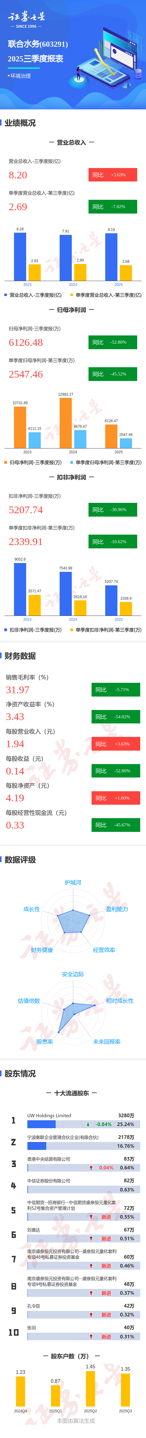 证券之星消息,联合水务2025年三季报显示,前三季度公司主营收入8.2亿元,同比上升3.63%;归母净利润6126.48万元,同比下降52.81%;扣非净利润5207.74万元,同比下降30.97%;其中2025年第三季度,公司单季度主营收入2.69亿元,同比下降7.03%;单季度归母净利润2547.46万元,同比下降45.53%;单季度扣非净利润2339.91万元,同比下降10.63%;负债率51.78%,投资收益-83.01万元,财务费用2690.86万元,毛利率31.97%。