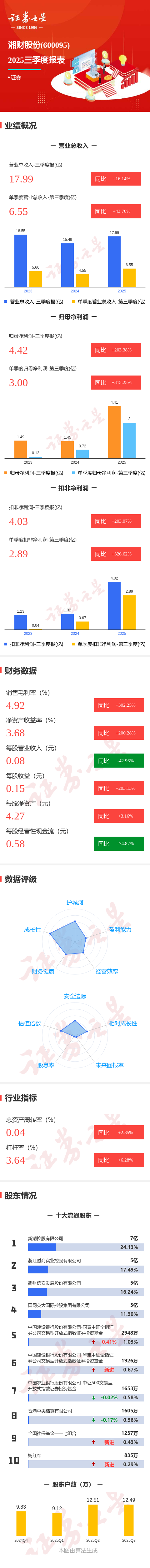 证券之星消息,湘财股份2025年三季报显示,前三季度公司主营收入17.99亿元,同比上升16.15%;归母净利润4.42亿元,同比上升203.39%;扣非净利润4.03亿元,同比上升203.07%;其中2025年第三季度,公司单季度主营收入6.55亿元,同比上升43.77%;单季度归母净利润3.0亿元,同比上升315.25%;单季度扣非净利润2.89亿元,同比上升326.63%;负债率72.49%,投资收益4.87亿元,财务费用3811.37万元,毛利率4.92%。