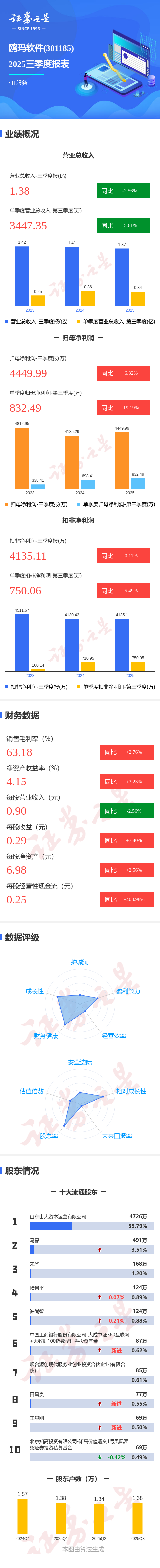 证券之星消息,鸥玛软件2025年三季报显示,前三季度公司主营收入1.38亿元,同比下降2.57%;归母净利润4449.99万元,同比上升6.32%;扣非净利润4135.11万元,同比上升0.11%;其中2025年第三季度,公司单季度主营收入3447.35万元,同比下降5.62%;单季度归母净利润832.49万元,同比上升19.2%;单季度扣非净利润750.06万元,同比上升5.5%;负债率2.95%,投资收益250.29万元,财务费用-667.74万元,毛利率63.18%。