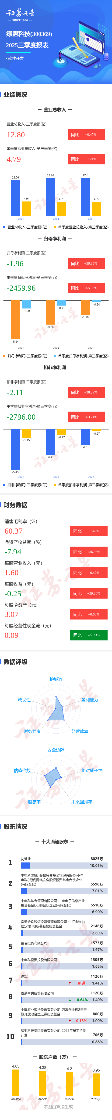 证券之星消息,绿盟科技2025年三季报显示,前三季度公司主营收入12.8亿元,同比上升0.47%;归母净利润-1.96亿元,同比上升39.85%;扣非净利润-2.11亿元,同比上升38.3%;其中2025年第三季度,公司单季度主营收入4.79亿元,同比上升1.22%;单季度归母净利润-2459.96万元,同比上升65.54%;单季度扣非净利润-2796.0万元,同比上升63.75%;负债率43.98%,投资收益-84.78万元,财务费用564.27万元,毛利率60.37%。