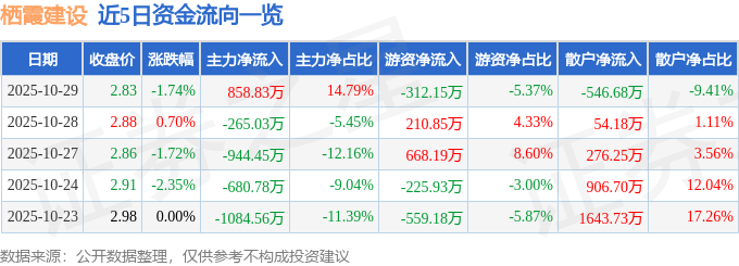 证券之星消息,截至2025年10月29日收盘,栖霞建设(600533)报收于2.83元,下跌1.74%,换手率1.96%,成交量20.57万手,成交额5808.1万元。