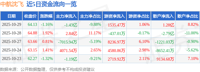 证券之星消息,截至2025年10月29日收盘,中航沈飞(600760)报收于64.13元,下跌1.16%,换手率0.82%,成交量22.54万手,成交额14.46亿元。