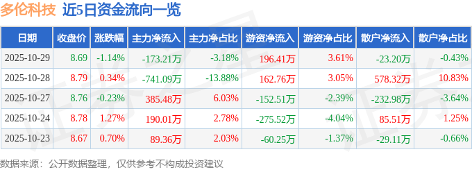 证券之星消息,截至2025年10月29日收盘,多伦科技(603528)报收于8.69元,下跌1.14%,换手率0.89%,成交量6.27万手,成交额5442.7万元。