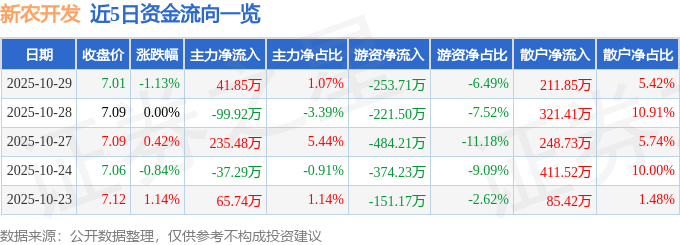 证券之星消息,截至2025年10月29日收盘,新农开发(600359)报收于7.01元,下跌1.13%,换手率1.46%,成交量5.58万手,成交额3910.67万元。