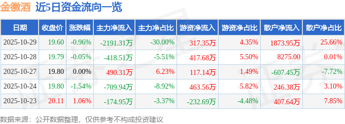 证券之星消息,截至2025年10月29日收盘,金徽酒(603919)报收于19.6元,下跌0.96%,换手率0.74%,成交量3.73万手,成交额7303.51万元。