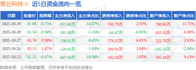 证券之星消息,截至2025年10月29日收盘,青云科技(688316)报收于61.08元,下跌0.75%,换手率2.27%,成交量1.09万手,成交额6638.67万元。