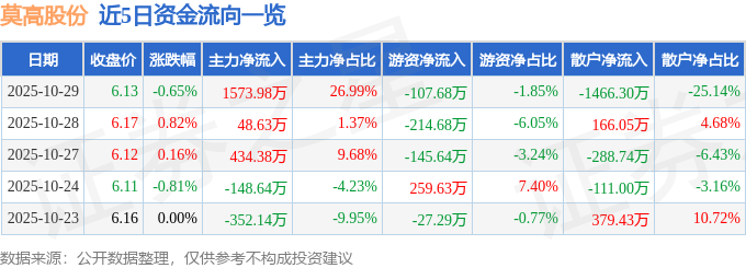 证券之星消息,截至2025年10月29日收盘,莫高股份(600543)报收于6.13元,下跌0.65%,换手率2.96%,成交量9.5万手,成交额5832.42万元。