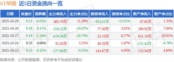 证券之星消息,截至2025年10月29日收盘,ST华扬(603825)报收于9.12元,下跌0.65%,换手率1.56%,成交量3.95万手,成交额3597.2万元。