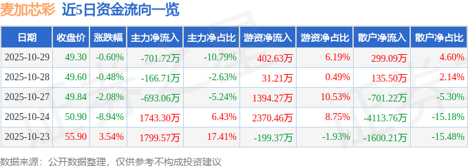 证券之星消息,截至2025年10月29日收盘,麦加芯彩(603062)报收于49.3元,下跌0.6%,换手率3.48%,成交量1.32万手,成交额6502.8万元。