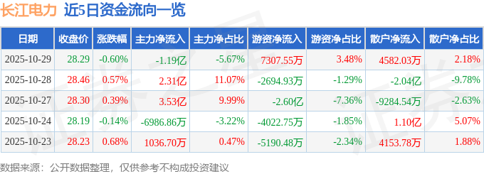 证券之星消息,截至2025年10月29日收盘,长江电力(600900)报收于28.29元,下跌0.6%,换手率0.31%,成交量74.05万手,成交额20.97亿元。