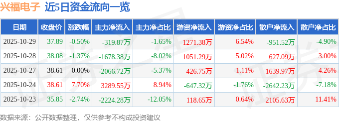 证券之星消息,截至2025年10月29日收盘,兴福电子(688545)报收于37.89元,下跌0.5%,换手率7.05%,成交量5.14万手,成交额1.94亿元。
