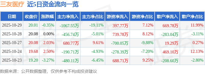 证券之星消息,截至2025年10月29日收盘,三友医疗(688085)报收于20.01元,下跌0.35%,换手率0.89%,成交量2.8万手,成交额5585.35万元。