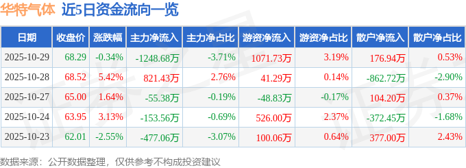证券之星消息,截至2025年10月29日收盘,华特气体(688268)报收于68.29元,下跌0.34%,换手率4.07%,成交量4.9万手,成交额3.36亿元。
