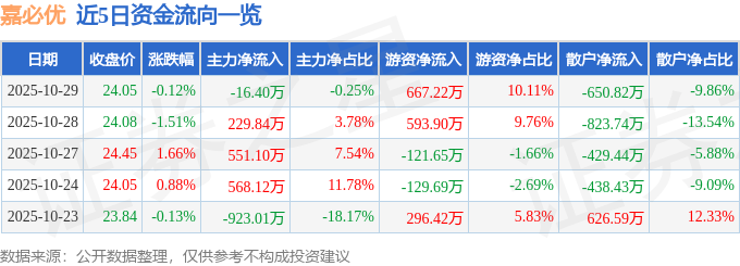 证券之星消息,截至2025年10月29日收盘,嘉必优(688089)报收于24.05元,下跌0.12%,换手率1.64%,成交量2.76万手,成交额6600.81万元。