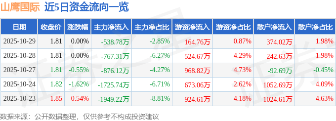 证券之星消息,截至2025年10月29日收盘,山鹰国际(600567)报收于1.81元,上涨0.0%,换手率1.8%,成交量104.81万手,成交额1.89亿元。
