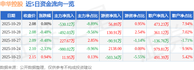 证券之星消息,截至2025年10月29日收盘,申华控股(600653)报收于2.08元,上涨0.0%,换手率1.49%,成交量28.92万手,成交额5961.19万元。