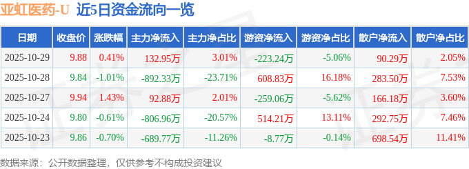 证券之星消息,截至2025年10月29日收盘,亚虹医药(688176)报收于9.88元,上涨0.41%,换手率1.03%,成交量4.49万手,成交额4413.36万元。