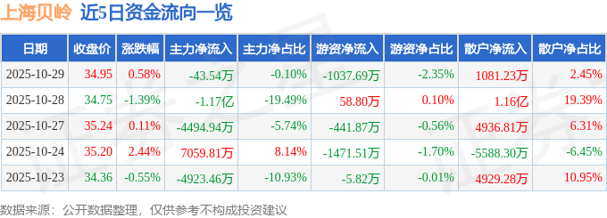 证券之星消息,截至2025年10月29日收盘,上海贝岭(600171)报收于34.95元,上涨0.58%,换手率1.78%,成交量12.64万手,成交额4.41亿元。