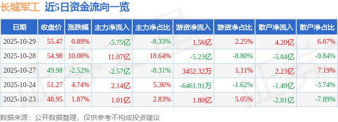 10月29日的资金流向数据方面,主力资金净流出5.75亿元,占总成交额8.33%,游资资金净流入1.56亿元,占总成交额2.25%,散户资金净流入4.2亿元,占总成交额6.07%。