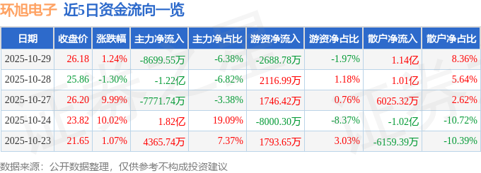 证券之星消息,截至2025年10月29日收盘,环旭电子(601231)报收于26.18元,上涨1.24%,换手率2.35%,成交量51.78万手,成交额13.63亿元。