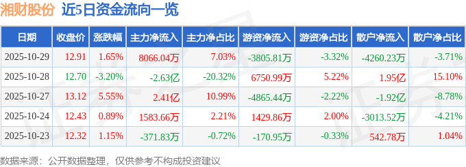 证券之星消息,截至2025年10月29日收盘,湘财股份(600095)报收于12.91元,上涨1.65%,换手率3.13%,成交量89.45万手,成交额11.48亿元。
