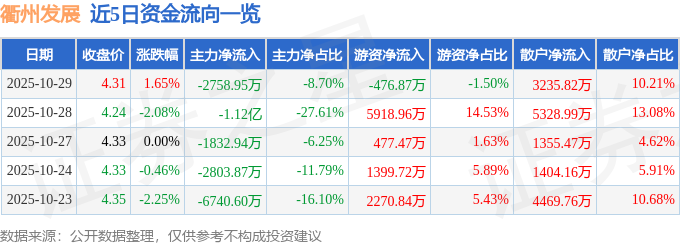 证券之星消息,截至2025年10月29日收盘,衢州发展(600208)报收于4.31元,上涨1.65%,换手率0.87%,成交量74.0万手,成交额3.17亿元。