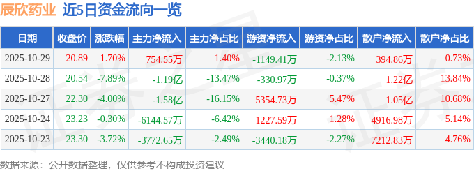 证券之星消息,截至2025年10月29日收盘,辰欣药业(603367)报收于20.89元,上涨1.7%,换手率5.81%,成交量26.32万手,成交额5.4亿元。