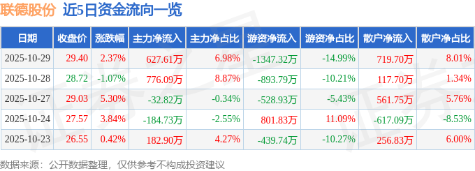 10月29日的资金流向数据方面,主力资金净流入627.61万元,占总成交额6.98%,游资资金净流出1347.32万元,占总成交额14.99%,散户资金净流入719.7万元,占总成交额8.01%。