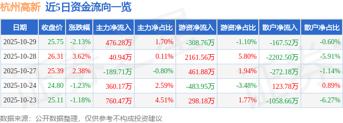 10月29日的资金流向数据方面,主力资金净流入476.28万元,占总成交额1.7%,游资资金净流出308.76万元,占总成交额1.1%,散户资金净流出167.52万元,占总成交额0.6%。