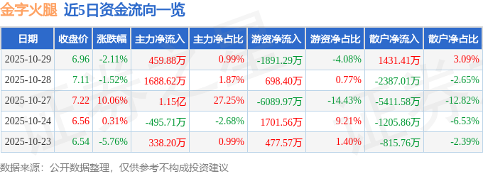 证券之星消息,截至2025年10月29日收盘,金字火腿(002515)报收于6.96元,下跌2.11%,换手率5.47%,成交量66.27万手,成交额4.64亿元。