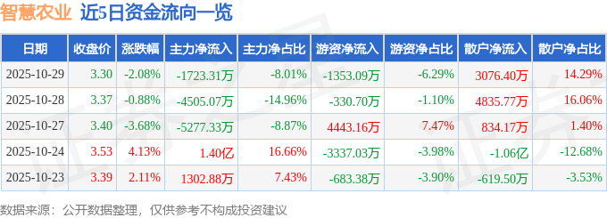 证券之星消息,截至2025年10月29日收盘,智慧农业(000816)报收于3.3元,下跌2.08%,换手率4.55%,成交量65.37万手,成交额2.15亿元。
