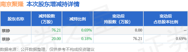 证券之星消息,10月29日南京聚隆发布公告《南京聚隆:关于特定股东减持计划实施完毕的公告》,其股东蔡静于2025年8月18日至2025年10月28日间合计减持96.21万股,占公司目前总股本的0.8707%,变动期间该股股价下跌6.7%,截止10月28日收盘报36.36元。