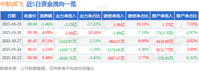 证券之星消息,截至2025年10月29日收盘,中航成飞(302132)报收于88.68元,下跌1.46%,换手率3.72%,成交量21.8万手,成交额19.33亿元。
