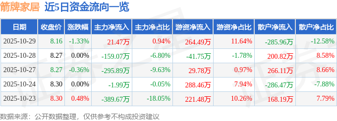 证券之星消息,截至2025年10月29日收盘,箭牌家居(001322)报收于8.16元,下跌1.33%,换手率0.35%,成交量2.79万手,成交额2272.94万元。