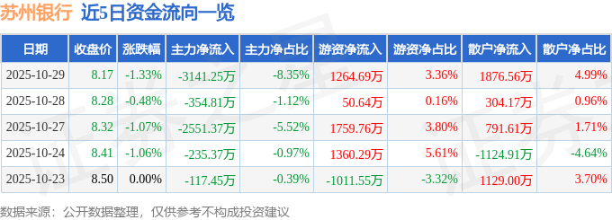 证券之星消息,截至2025年10月29日收盘,苏州银行(002966)报收于8.17元,下跌1.33%,换手率1.05%,成交量46.02万手,成交额3.76亿元。