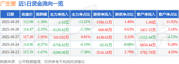 证券之星消息,截至2025年10月29日收盘,广生堂(300436)报收于112.98元,下跌1.3%,换手率7.44%,成交量10.17万手,成交额11.38亿元。