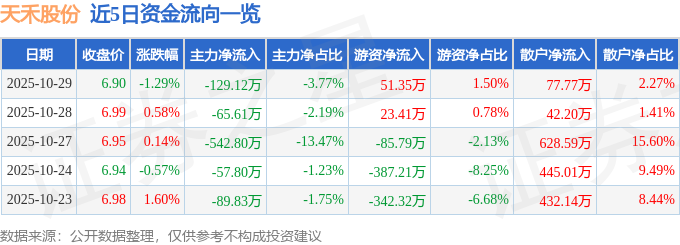 证券之星消息,截至2025年10月29日收盘,天禾股份(002999)报收于6.9元,下跌1.29%,换手率1.44%,成交量4.96万手,成交额3421.08万元。