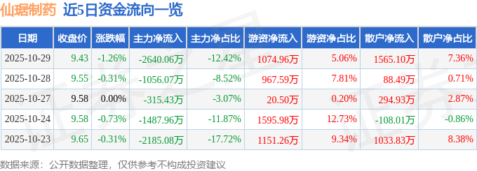 证券之星消息,截至2025年10月29日收盘,仙琚制药(002332)报收于9.43元,下跌1.26%,换手率2.29%,成交量22.58万手,成交额2.13亿元。