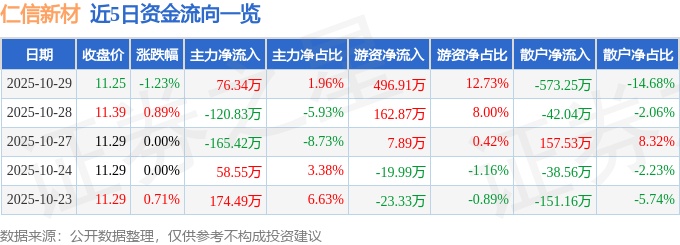 证券之星消息,截至2025年10月29日收盘,仁信新材(301395)报收于11.25元,下跌1.23%,换手率2.67%,成交量3.43万手,成交额3904.87万元。