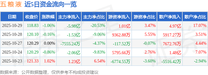 证券之星消息,截至2025年10月29日收盘,五 粮 液(000858)报收于118.83元,下跌1.06%,换手率0.63%,成交量24.51万手,成交额29.11亿元。