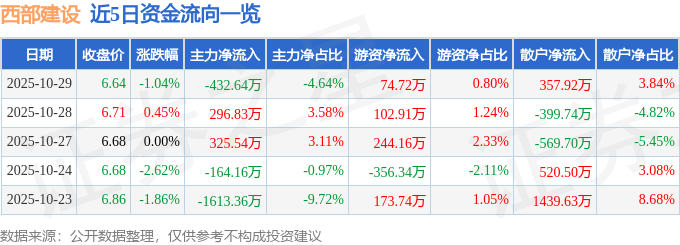 证券之星消息,截至2025年10月29日收盘,西部建设(002302)报收于6.64元,下跌1.04%,换手率1.12%,成交量14.12万手,成交额9318.26万元。