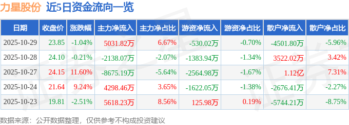 证券之星消息,截至2025年10月29日收盘,力星股份(300421)报收于23.85元,下跌1.04%,换手率13.74%,成交量31.66万手,成交额7.55亿元。